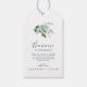 Ces étiquettes de bienvenue mariage double face verdoyantes d'été sont parfaites pour un mariage bilingue du milieu de l'été. Le design botanique présente un agencement luxuriant d'eucalyptus couleur aquarelle peint, de verdure et de feuilles verts avec de subtils ressorts de fleurs roses rousses. Personnalisez les étiquettes avec l'emplacement de votre mariage, une brève note de bienvenue, vos noms et la date du mariage. Personnalisez le dos avec les mêmes informations dans une langue différente. Ces étiquettes sont parfaites pour les mariages de destination et les sacs de bienvenue des clients de l'hôtel.