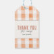This cute "baby brunch" girl baby shower gift tag features a cream background with brunch foods such as waffles, coffee, croissant, avocado, orange, bananas, egg, blueberries, and strawberry . The reverse side features a white background with gingham check pattern in orange. Personalize it for your needs. You can find matching products at my store.
