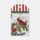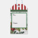 Étiquettes cadeaux de Noël avec des boughs cardinaux et pins, rayures rouges et blanches et bande verte.