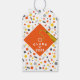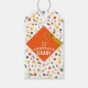 Félicitations à la remise des diplômes créatifs pour le tag cadeau et les faveurs de la fête des grands, mettant en vedette le casquette orange avec un goût d'or sur arrière - plan confetti. Modifier le texte pour ajouter le nom de la catégorie et l'année de la classe supérieure.