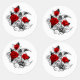 Contour, lune de croissant mécanique avec des engrenages, décoré de roses rouges avec des tiges noires spirées et feuilles sur arrière - plan blanc. Steampunk
