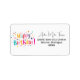 Cette étiquette d'adresse présente un message festif "Joyeux Anniversaire !" stylisé dans des couleurs rétro amusantes et vibrantes. Le design est entouré d'une dispersion ludique de points et d'étoiles multicolores qui ressemblent à des confettis de célébration. Placé sur un fond blanc propre, il comprend des sections claires pour un nom et une adresse de retour dans une mise en page simple et lisible. Les formes sarcelles, roses et orange vives donnent à l'étiquette une atmosphère de fête énergique et nostalgique. C'est une façon joyeuse de décorer votre courrier d'anniversaire et de faire en sorte que chaque enveloppe ressemble à une célébration avant même qu'elle ne soit ouverte.