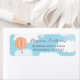 Customisez ces belles étiquettes d'adresse de retour de Baby shower élégantes, avec une illustration originale d'une montgolfière rayée rose et jaune volant haut dans le ciel avec des nuages blancs.