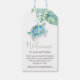 Ces étiquettes de cadeau de bienvenue de mariage sur la plage présentent ma tortue de mer originale aquarelle et des feuilles de palmier monstera dans des nuances de bleu, de turquoise et de vert. Le mot Bienvenue est écrit dans une police de caractères manuscrite tendance. Peut être personnalisé pour lire "Bienvenue à mon shower de mariée". L'étiquette de faveur est au verso d'une couleur vert sauge uni. Pour voir la suite de mariage complète, visitez www.zazzle.com/dotellabelle