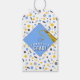 Étiquette de cadeau de félicitations de remise des diplômes créative et faveurs de fête de remise des diplômes, avec une casquette bleu clair et un gland doré sur fond de confettis. Modifiez le texte pour ajouter le nom du diplômé et l'année de la promotion.