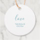Ces étiquettes de faveur uniques présentent les noms des mariés dans une police de script à lettres manuscrites modernes sur une couleur bleu turquoise uni. La carte inverse présente une personnalisation de couleur complémentaire sur fond blanc uni. Utilisez-les pour des cadeaux de proposition de demoiselles d'honneur, des remerciements aux invités d'hôtel et des faveurs de mariage ou de fête. Pour voir les articles assortis par Victoria Grigaliunas, visitez DoTellABelle sur Zazzle à www.zazzle.com/dotellabelle