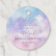 Étiquette de faveur de mariage rêveuse et romantique avec une illustration aquarelle du ciel violet, rose et bleu avec des étoiles et des nuages.
