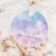 Étiquette de faveur de réception de mariage rêveuse et romantique avec une illustration aquarelle du ciel violet, rose et bleu avec des étoiles et des nuages.