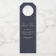 Étiquettes personnalisées pour accrocher les bouteilles de vin pour mariage et shower de mariage avec un design moderne simple à l'écriture manuscrite sur fond bleu marine foncé.