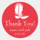 Cowboy Boot Merci Étiquettes (Rouge / Blanc)...Ces cowboy ou cowgirl boot merci étiquettes sont l'ajout parfait à votre remerciement faveurs pour votre mariage de destination à thème occidental. Parfait pour la mariée et le marié qui ont leur réception de mariage dans un ranch de dude ou dans une grange rustique ou pour la mariée et le marié qui aiment monter à cheval, danser en ligne, ou aimer la musique country et occidentale. Idéal pour un mariage country chic. Le design comporte une jolie botte de cowboy. Voir WindyCityStationery.com pour notre gamme complète de étiquettes "Cowboy Boot" dans une large gamme de couleurs ainsi que les timbres-poste "Cowboy Boot" correspondants, cartes de remerciements, étiquettes d'adresse de retour, enregistrer les dates et plus encore.