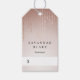 Les étiquettes à accrocher chic pour votre boutique ou votre commerce de détail présentent du lettrage noir classique sur un arrière - plan rose pâle et sombre, orné de fils de ficelles roses en feuille d'or. Personnalisez avec deux lignes de texte personnalisé. Espace blanc prévu pour écrire dans vos prix. Réglez le symbole monétaire au besoin à l'aide du modèle. Les sacs sont de couleur rose pâle pastel pour votre texte personnalisé ou message manuscrit supplémentaire.