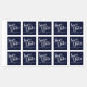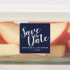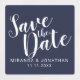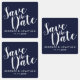Modern Script Navy Blue Faire-part de mariage Suite : Save the Date Sticker avec le titre "Save the Date" en blanc police de script moderne avec le nom et la date en moderne sans serif police sur marine bleu arrière - plan.