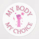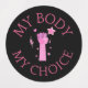 Montrez votre soutien aux droits des femmes avec ce fer pro-choix sur la conception de étiquette alimentaire / produit rond avec un poing rose levé au centre avec le texte "mon corps mon choix".