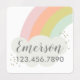 Un autocollant de étiquette fantaisiste avec un arc-en-ciel pastel avec nuage blanc et calligraphie Nom et numéro de téléphone de l'enfant en dessous. Ajoutez-le à la variété des articles de retour à l'école pour faciliter l'étiquetage avec personnalité et flair. Idéal pour les articles durs ou doux comme les boîtes à lunch, les bouteilles d'eau, les sacs de livres, les couvertures, les uniformes, les chemises, les vestes, les serviettes et autres articles personnels. Recherchez les accessoires de coordination et les variations de couleurs supplémentaires de Stacey Meacham.