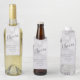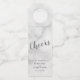 Ce porte-bouteille comporte le titre 'Cheers' dans une police de caractères grise moderne avec nom et date dans une police sans empattement moderne sur fond de marbre blanc.