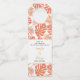Tag de mariage de bouteille feuille moderne corail et or tropical. Un beau motif de feuilles de Split Leaf Philodendron (Monstera deliciosa) ou de Plante de Fromage Suisse et de feuilles de palmiers en corail vivant avec contour doré ornent ce design. Votre libellé est dans un cadre blanc avec contour doré. L'arrière comprend un motif à points de polka doré.
