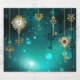 Or, clés antiques avec engrenages et cadrans accrochés sur chaînes dorées sur arrière - plan vert lumineux.