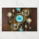 Turquoise lenses with antique watch with brass gears and golden keys on rusty, brown background. Steampunk style.