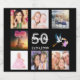 Un étiquette de bouteille pour une fête de 50ème anniversaire, célébrant sa vie avec un collage de 8 de vos photos. Modèles pour un nom, 50 ans et une date. Date de naissance ou date de la fête. Lettres blanches et grises. Arrière - plan noir élégant.