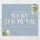 Un design élégant pour une fête prénatale de bébé garçon avec une typographie chic et un beau feuillage botanique vert sur un fond bleu poussiéreux. Conçu par Thisisnotme©