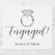 Ces étiquettes personnalisées pour vin pétillant disent Fancées ! avec une bague de fiançailles diamant blanc à bandes argentées et les noms des mariés en bas. Parfait pour une fête de fiançailles !