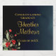 Delicate, sophistiquée et pleine d'élégance fête de graduation vin mousseux étiquette avec un arrangement floral simple, mais belle sur le coin inférieur gauche avec de magnifiques fleurs rouges et complimenté exquis plantes vertes. Elégante typographie dorée personnalisable pour les détails de l'événement sur un dégradé bleu minuit pour arrière - plan. Félicitations diplômés !