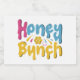 Ce design de t-shirt évoque la douceur avec "Honey Bunch" dégoulinant de charme multicolore. Chaque lettre est ornée de tourbillons et de gouttes ludiques, ressemblant à du miel de bonbon. La palette de couleurs est un éclat de soleil, avec des teintes vives et joyeuses comme le jaune soleil, le rose bubblegum et le bleu ciel. C'est un choix parfait pour quiconque veut répandre une touche de douceur et célébrer les personnes spéciales dans leur vie.