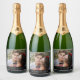 Vin mousseux moderne Étiquettes photo. Ce design comprend des photos de mariées et mariées et du texte blanc avec leurs noms, date et emplacement du mariage.