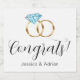 Ces étiquettes de vin pétillant sur mesure disent Félicitations ! avec un ensemble de bagues de mariage en diamant avec les noms de mariée et de mariée sur le fond. Parfait pour un fiançailles ou une fête de mariage !