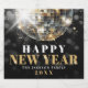 Celebrate in style with this elegant New Year’s Eve champagne bottle label featuring a bold black background and festive disco ball details. "Happy New Year" is displayed in a mix of white and gold serif fonts for a refined and celebratory feel. Below the greeting, there’s space to personalize with the family or host’s name and the year—making it perfect for toasting in the new year.