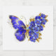 Bijoux, bleu, saphir, papillon aux fleurs pétillantes avec aile décorée de bleu, fleurs précieuses avec feuilles d'or sur arrière - plan blanc.