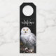 Portrait animal photo d'une majestueuse chouette enneigée debout sur une branche avec un nom personnalisé personnalisé monographie ci-dessus.