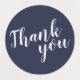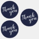 Script moderne Marine Blue Wedding Favor Merci Étiquettes avec le titre "Merci" en blanc police de caractères modernes sur marine bleu arrière - plan.