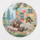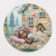 Une jeune fille avec des fleurs colorées dans les cheveux dort paisiblement devant une maison fantaisiste faite de divers morceaux de papier coloré. Des arbres à fleurs et des fleurs fleuries entourent la scène, créant une atmosphère onirique. Photoshop Art numérique CS5