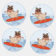 Caractère animal amusant le carlin heureux chevauchant un surf sur une vague océanique