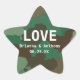 Un autocollant en forme d'étoile est recouvert d'une empreinte de camouflage vert. L'amour est écrit dans une grande police simple. Les noms des mariés et des mariés et leur date de mariage sont écrits en blanc ci-dessous.