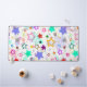 un design multicolore mélange des formes d'étoiles pleines et évidées dans une harmonie ludique et chaotique de rouge, violet, bleu, or et sarcelle sur un fond blanc