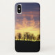 Derrière les silhouettes d'arbres nus et dénudés de l'hiver, un navire fantôme navigue à travers les nuages d'un ciel de coucher de soleil.