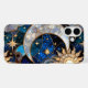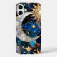Étui élégant pour iPhone présentant un magnifique design céleste de style vitrail avec un croissant de lune, un soleil radieux et des étoiles scintillantes sur un fond de galaxie bleu foncé. Les couleurs riches et les accents dorés créent un look audacieux, luxueux et mystique.