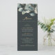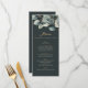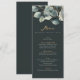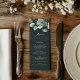 Cette élégante carte de table de menu présente un design élégant avec "Menu" écrit dans un script doré raffiné, complété par les noms du couple et la date mariage sous une police serif légère. Chaque titre de cours est magnifiquement affiché dans le même script doré, avec les détails du plat suivant dans une police serif sophistiquée et minimaliste. Ornée de délicats feuilles d'eucalyptus contre un arrière - plan vert foncé, cette carte ajoute une touche luxueuse d'inspiration nature à l'expérience culinaire. Parfait pour les mariages, les réceptions ou les fêtes spéciales, cette carte de menu combine éléments botaniques modernes et design épuré et intemporel.