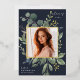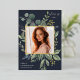 Notre faire-part de graduation Eucalyptus & Sage encadre une photo de votre diplômé avec une bordure carré élégante d'eucalyptus couleur d'eau luxuriante et de feuilles verts sauge, avec de véritables garnitures en feuille d'or sur un arrière - plan bleu marine de minuit. Personnalisez avec l'année de classe, le nom et l'école de votre diplômé. Ajoutez un message personnel à l'arrière, ainsi qu'une photo supplémentaire.
