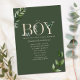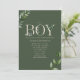 Thème douche garçon avec lettrage "BOY" en beige entouré de verdure d'eucalyptus. L'Arrière - plan est vert foncé à l'avant. Le côté inverse est beige.