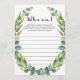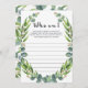 Vous cherchez un jeu amusant à jouer à votre douche nuptiale? Jouez Qui suis-je avec ces belles cartes de jeu de la couronne de verdure. C'est l'ajout parfait à votre jardin ou douche botanique nuptiale et c'est un succès à votre fête! Laissez vos invités de douche nuptiale écrire un souvenir qu'ils ont avec la mariée. Quand tout le monde a listé un souvenir, lisez-les à haute voix et laissez la mariée deviner avec qui elle a eu le souvenir. Si elle a tort, l'invitée gagnera ! Le jeu sera un grand briseur de glace et un début de conversation pour votre douche nuptiale.