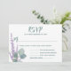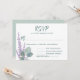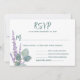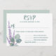 Cartes de réponse Eucalyptus et lavender mariage avec espace pour une liste d'options de menu pour les invités. Customisez selon vos besoins avec du texte vert gris dans les polices modernes. Une branche de lavande avec des feuilles d'eucalyptus est le dessin imprimé sur le coin inférieur gauche des cartes blanches. Reverse est vert clair solide.