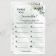 Où était-elle ? Version anglaise et espagnole inclus (avant et arrière). Ajoutez Bride to be Name dans le modèle pour les versions anglaise et espagnole. Pour plus de personnalisation (modifier le libellé, ajouter ou supprimer le nombre de photos, la couleur de police, le style de police ), cliquez sur personnaliser, faites défiler et cliquez sur le lien "cliquer pour customiser plus loin". COMMENT JOUER : Affichez les photos de la mariée pour être sur différents emplacements, et numérotez-les. Les clients notent leur devinette sur chaque photo et la personne qui a les réponses les plus correctes gagne !