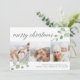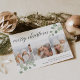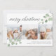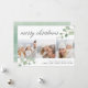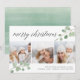 Cette carte de vacances festive présente des feuilles d'eucalyptus aquarelles vert sauge pastel ornant trois de vos photos carrées préférées disposées côte à côte dans un format de collage. « Joyeux Noël » apparaît en haut dans une typographie manuscrite. Personnalisez avec votre message personnalisé et vos noms en bas à droite.
