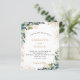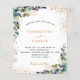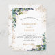 Un arrière - plan blanc décoré de verdure d'eucalyptus et de feuillage doré. Personnalisez et ajoutez vos noms et les détails du mariage. Lettres noires et dorées. Retour : ajoutez votre weburl à votre site mariage pour RSVP ou détails.