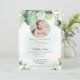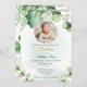 Ce beau baptême ou cette invitation à baptiser présente un arrière - plan naturel avec eucalyptus vert et une croix d'or au centre. Le dos de la carte est vert eucalyptus.