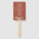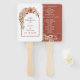 Cette conception de programme de mariage de fan de main est une pièce remarquable qui impressionne tout le monde. Il dispose d'une belle arche décorée d'un agencement fleuri de terre cuite et de fleurs beiges, lui donnant un aspect doux et élégant qui convient à une journée spéciale. Sur le dos du ventilateur, un joli bouquet de fleurs aux couleurs automnales, dressé contre un arrière - plan couleur terre cuite, en fait un élément distinctif et inoubliable pour la journée spéciale du couple.