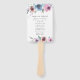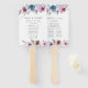 Élégant programme de mariage floral éventail main avec vos noms encadrés par des bouquets de fleurs violet, mauve et bleu aquarelle et feuilles verts. Personnalisez les fans du programme de mariage floral en ajoutant la date et l'emplacement de votre mariage, l'ordre des événements et la fête de mariage au dos. Conçu pour coordonner avec notre collection de mariages Midnight Blooms.